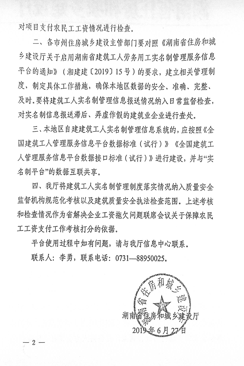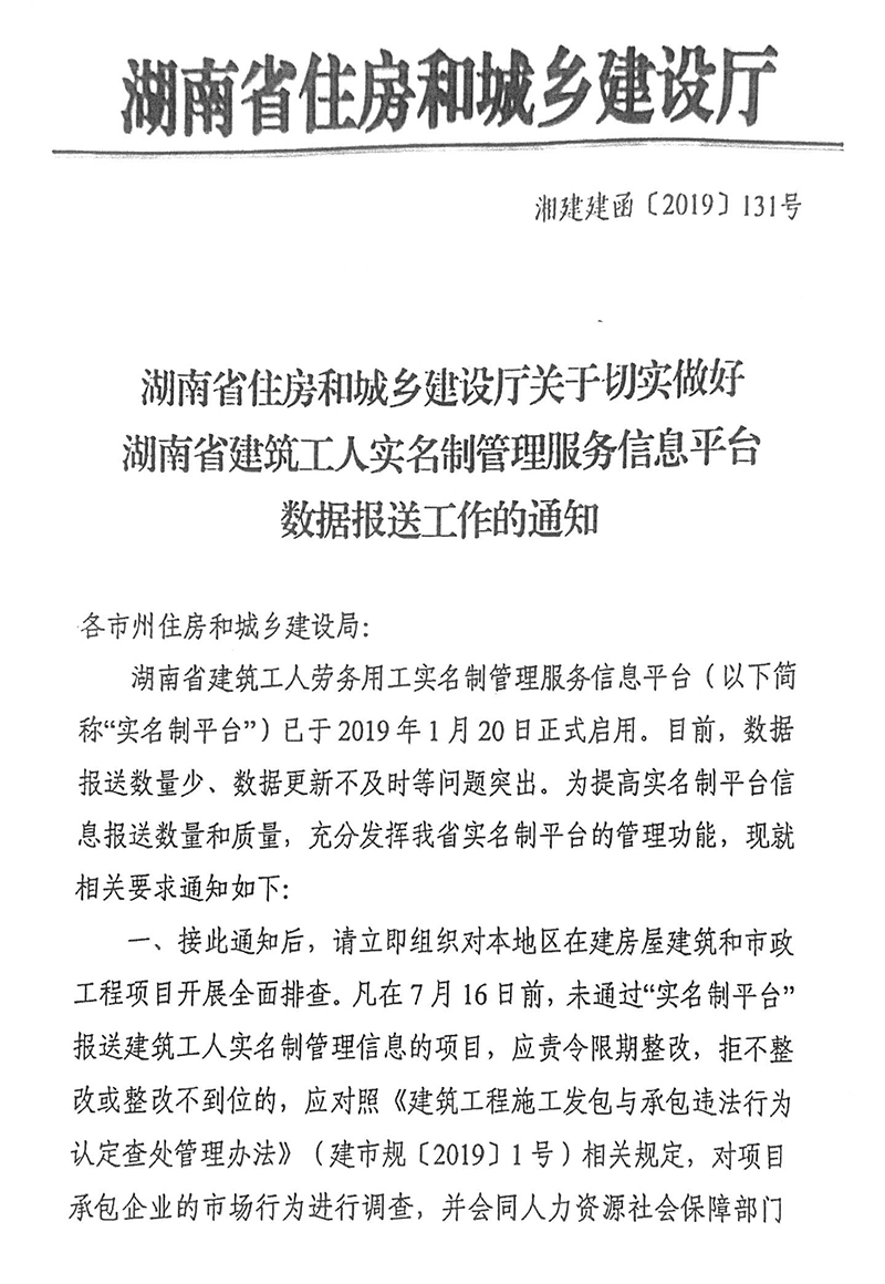 关于切实做好湖南省建筑工人实名制管理服务信息平台数据保送工作的通知